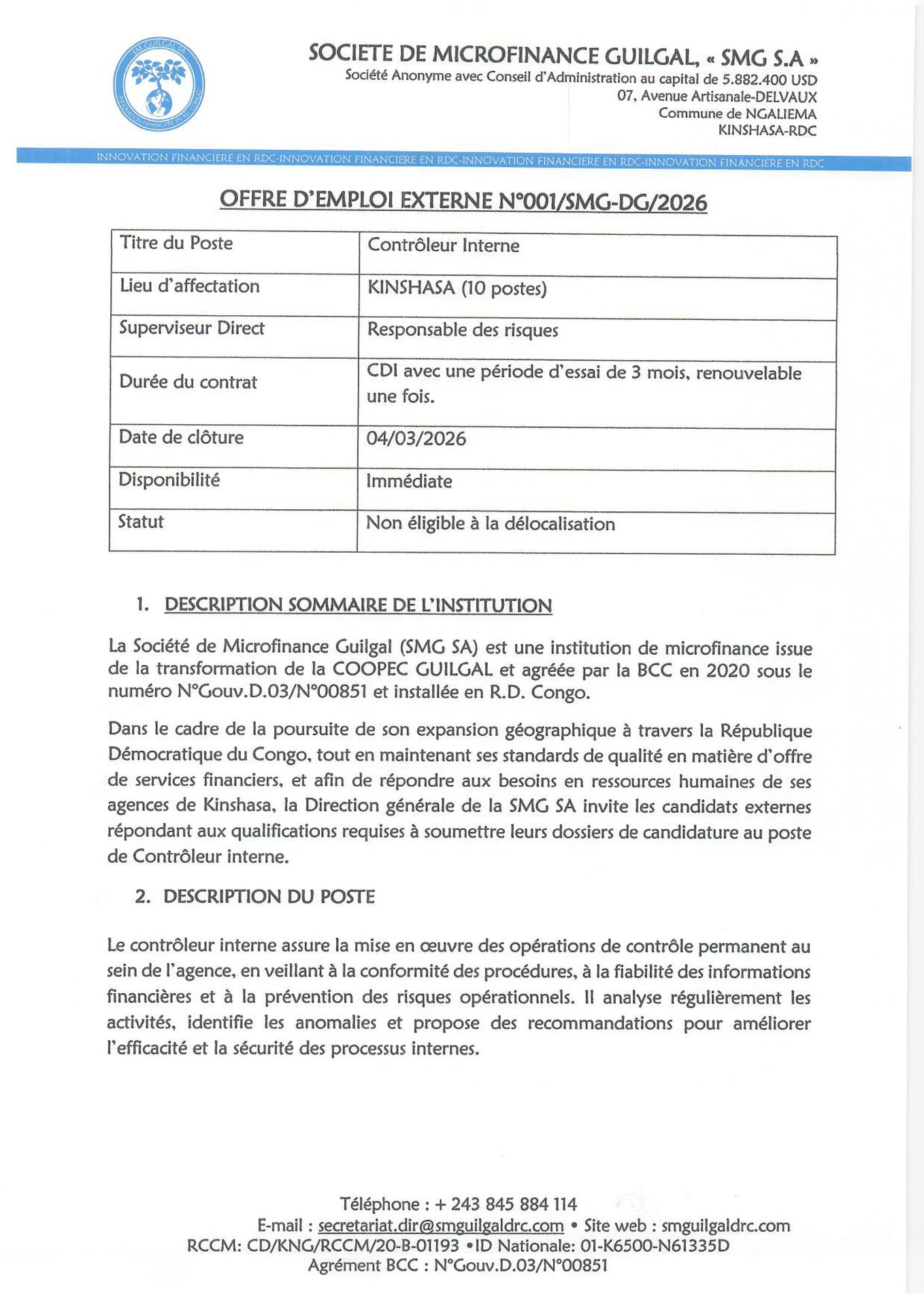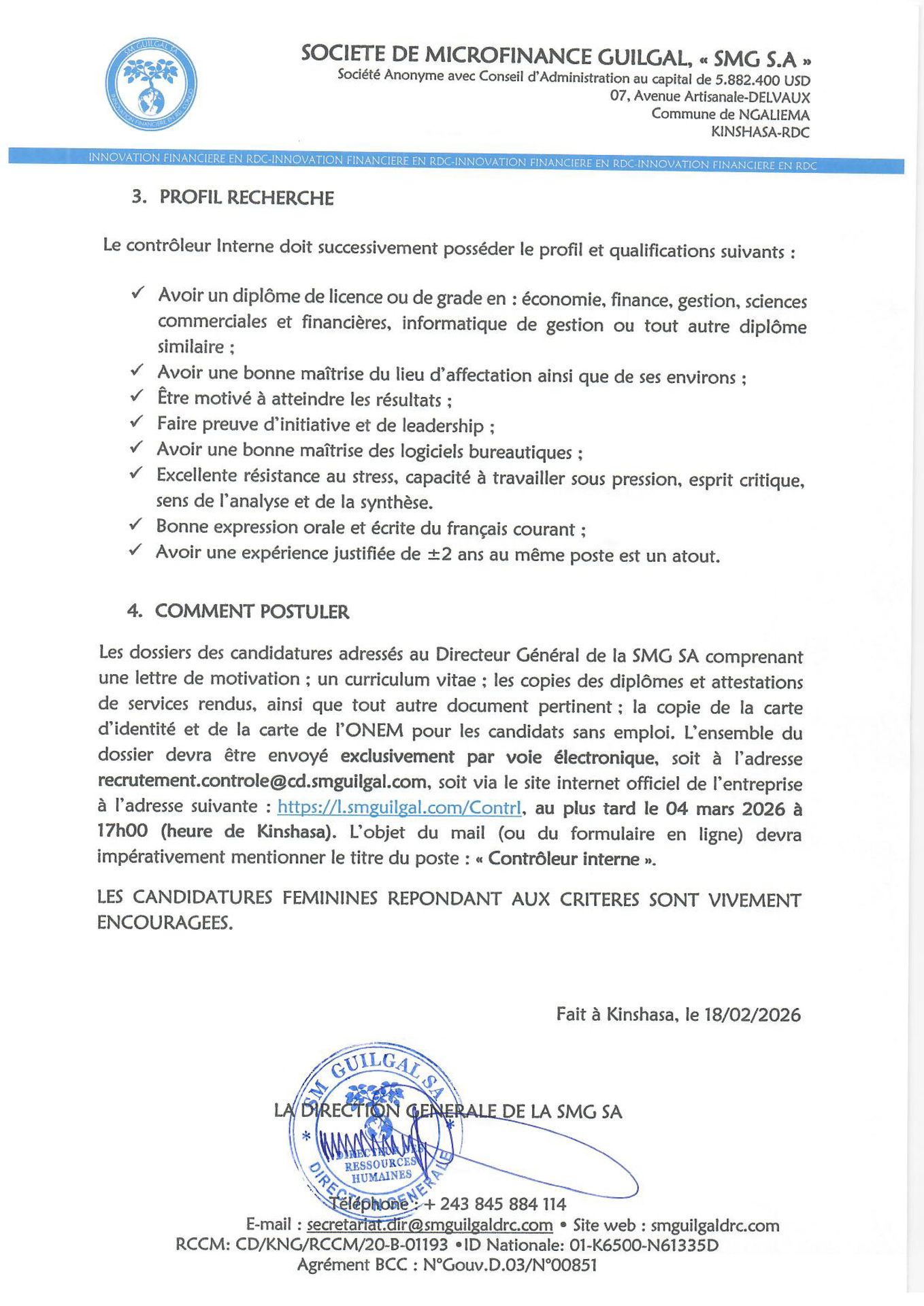 Les dossiers des candidatures adressés au Directeur Général de la SMG SA comprenant une lettre de motivation ; un curriculum vitae ; les copies des diplômes et attestations de services rendus, ainsi que tout autre document pertinent ; la copie de la carte d’identité et de la carte de l’ONEM pour les candidats sans emploi. L’ensemble du dossier devra être envoyé exclusivement par voie électronique, soit à l’adresse [email protected], soit via le site internet officiel de l’entreprise à l’adresse suivante : https://l.smguilgal.com/ContrI, au plus tard le 04 mars 2026 à 17h00 (heure de Kinshasa). L’objet du mail (ou du formulaire en ligne) devra impérativement mentionner le titre du poste : « Contrôleur interne ».